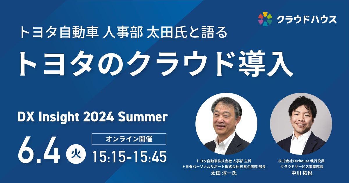 大企業向け人事労務DXクラウド『クラウドハウス労務』を運営する株式会社Techouse(本社所在地:東京都港区、代表取締役:礒邉基之)は、日経BP主催の「DX Insight 2024 Summer」にて、トヨタ自動車 人事部 主幹の太田氏と、Techouse 執行役員 クラウドサービス事業部長の中川が対談することをお知らせいたします。