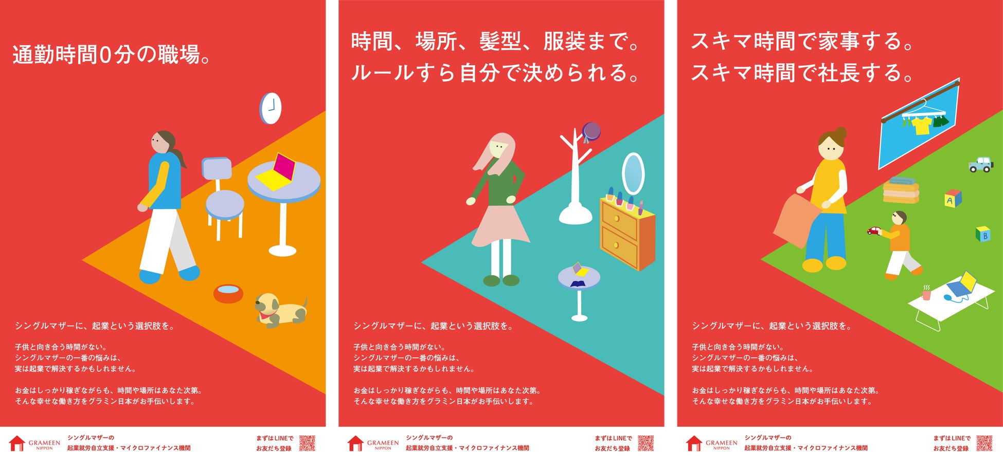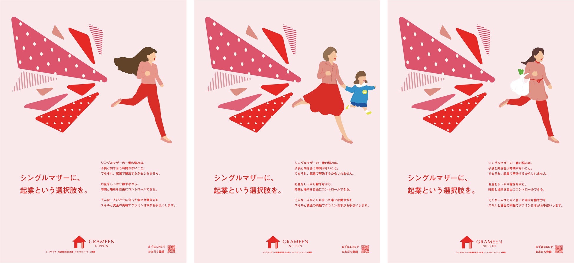 ブランドメッセージと合わせて、ブランドビジュアルも発表します。全6種類となるグラフィックを、グラミン日本オフィスや、サポート企業様へポスター配布(A・B、お好きなビジュアルを配布致します。)をはじめ、オフィシャルSNSや各種メディア、シングルマザーの支援を対象としたワークショップ会場等、幅広い場所にて新しいメッセージ・ビジュアルを露出していきます。