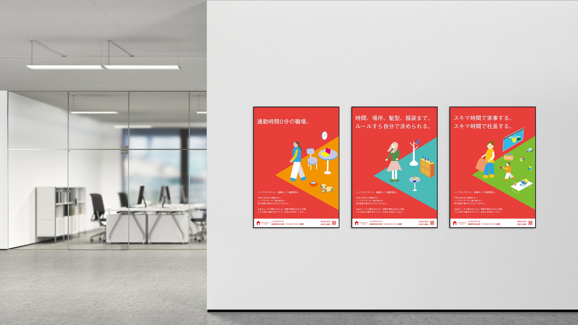 三角のモチーフは、シングルマザーの進む道を示し、新たなキャリアを前向きに進んでいくことを表現しています。また、複数のイラストは、自分らしく新しい道を前向きに走っていくイメージで制作しました。走る女性だけではなく、子どもを連れている女性、買い物をしている女性な、具体的なイメージも含めたパターンを描いています。