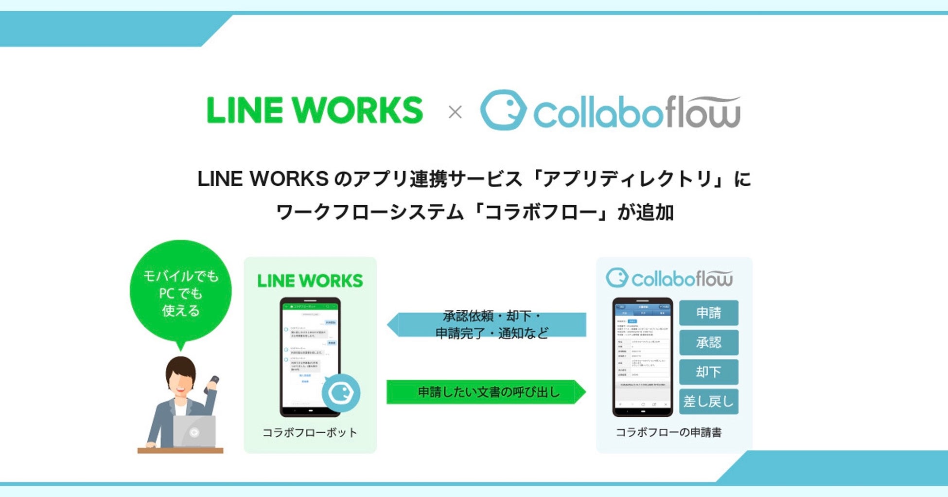 「ワークスタイルの未来を切り拓く」を理念に掲げ、クラウドサービス「コラボフロー」を提供する株式会社コラボスタイル(所在地:愛知県名古屋市、代表取締役社長 兼 CEO:松本 洋介)は、ワークスモバイルジャパン株式会社(本社:東京都渋谷区、代表者:増田 隆一)が提供するビジネスコミュニケーションツール「LINE WORKS」のアプリ連携プラットフォーム「アプリディレクトリ」に対応したことをお知らせします。この対応により、コラボフローとLINE WORKSとの連携設定が従来より簡潔になりました。