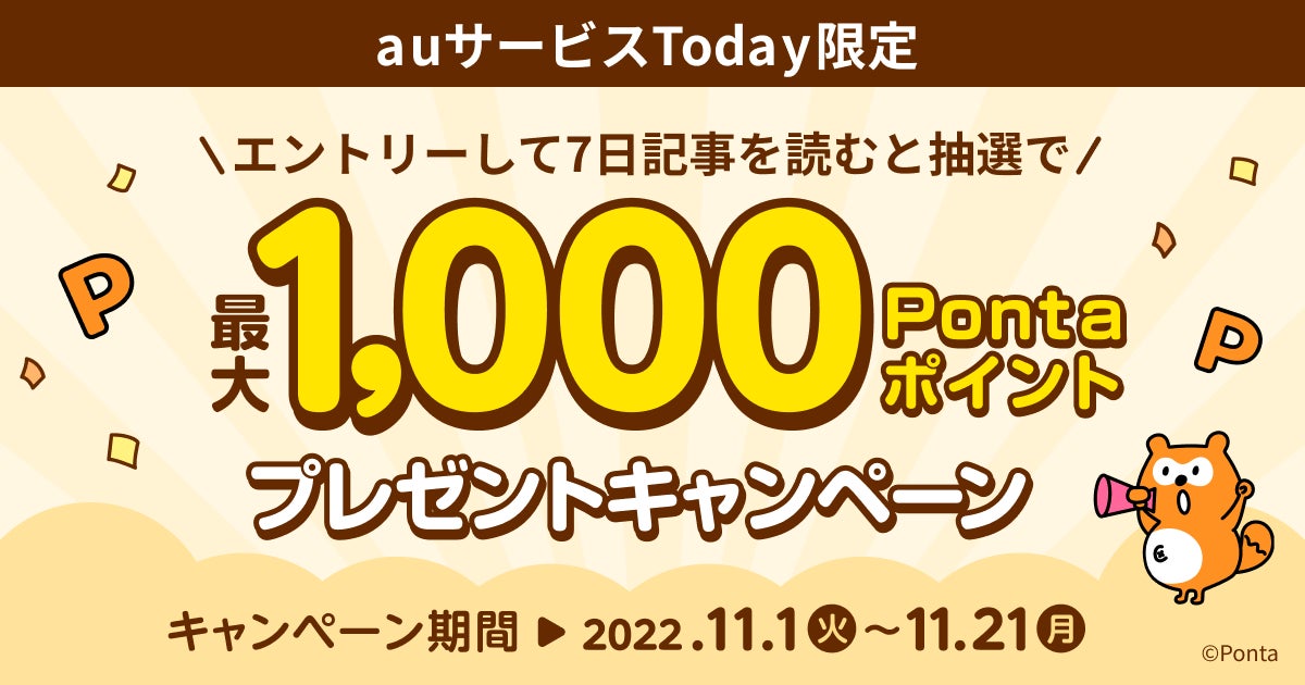 auサービスTodayアプリでキャンペーンにエントリーして合計7日間記事を読むと 抽選で最大1,000Pontaポイントが当たる!外れても必ず10Pontaポイントもらえます。