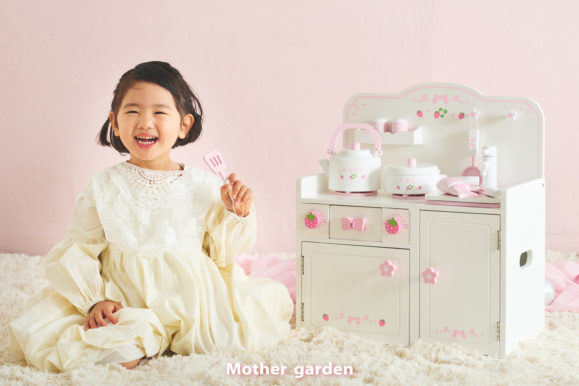 昨今、おままごと遊びは子どもの想像力や創造性を育む重要な遊びとして注目されています。『マザーガーデン』では、子どもだけでなく親も一緒に楽しめるよう、安全でかわいい木製玩具の開発に力を入れており、「スウィートストロベリーキッチン」とツールセットもその想いを込めた製品です。天然木とMDF素材を使用した長く使える玩具で、親子で楽しい時間をお過ごしください。