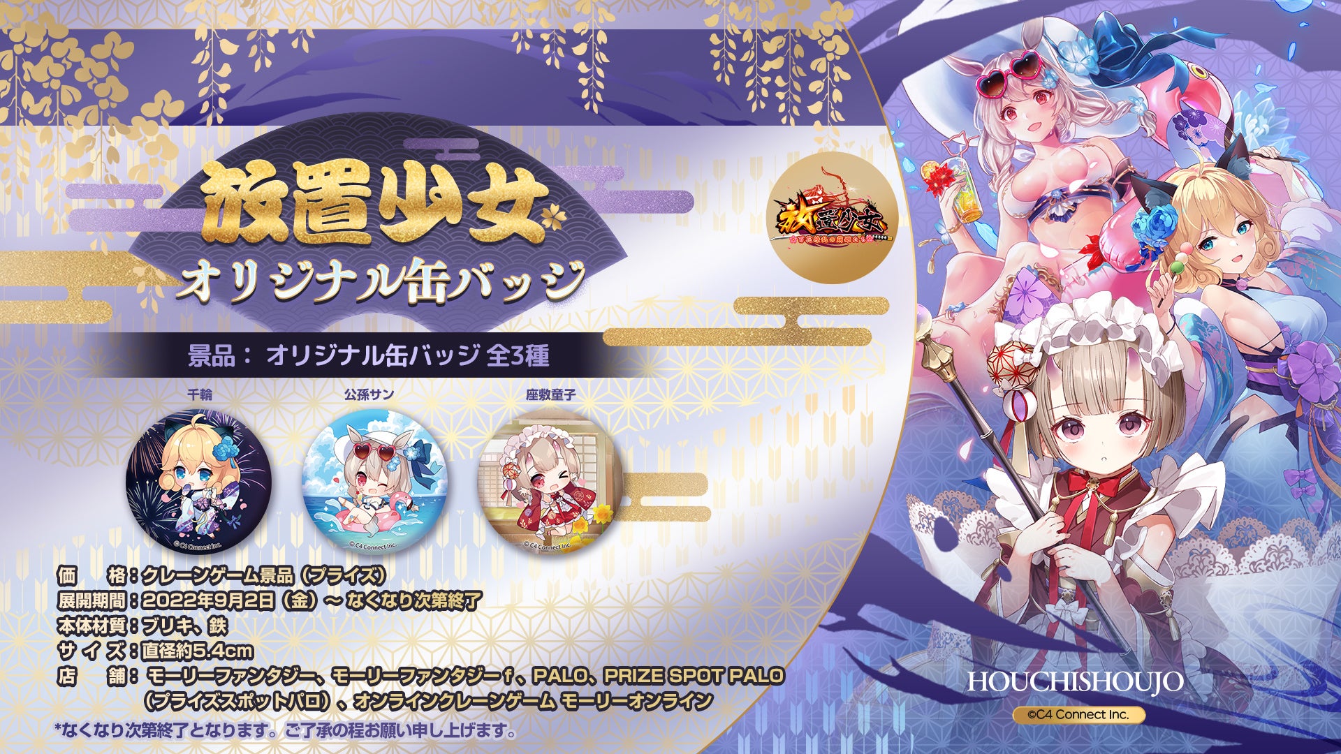 C4 Connect株式会社(本社:東京都新宿区)は、現在サービス中の美少女RPGゲーム『放置少女〜百花繚乱の萌姫たち~』(スマートフォンアプリ及びブラウザ版)(以下、『放置少女』)が9月2日(金)より「放置少女オリジナル缶バッジ」を展開することをお知らせいたします。