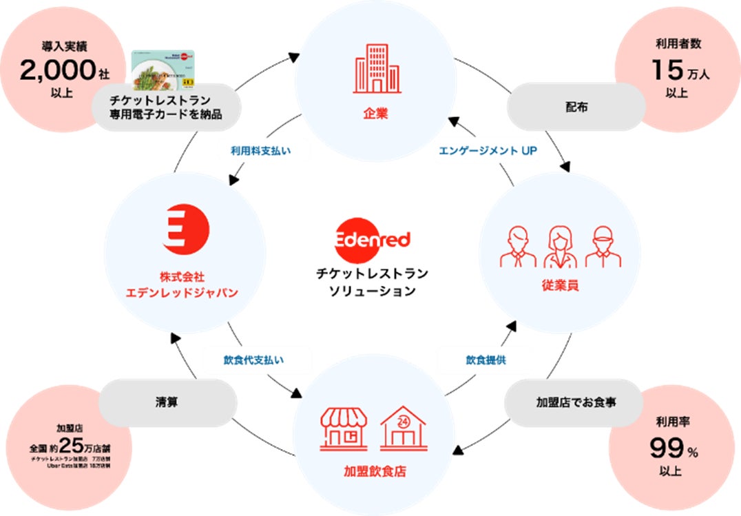 エデンレッドジャパンの「チケットレストラン」は、レストラン、カフェ、ファミリーレストラン、コンビニエンスストアなどの加盟店で⾷事や飲⾷物の購⼊ができるICカードタイプの⾷事補助サービスで、従業員の福利厚⽣として利⽤されています。⽇本で35年以上の実績を誇り、国内最⼤規模の⾷事補助ソリューションで、導⼊実績2,000社以上、利⽤者は15万⼈に達します。また2023年3月のUber Japanとの業務提携により、全国のご利用者様へ Uber Eats を介したデリバリーサービスを開始し、利用可能店舗は、全国約25万店舗へと飛躍的に拡大しました。