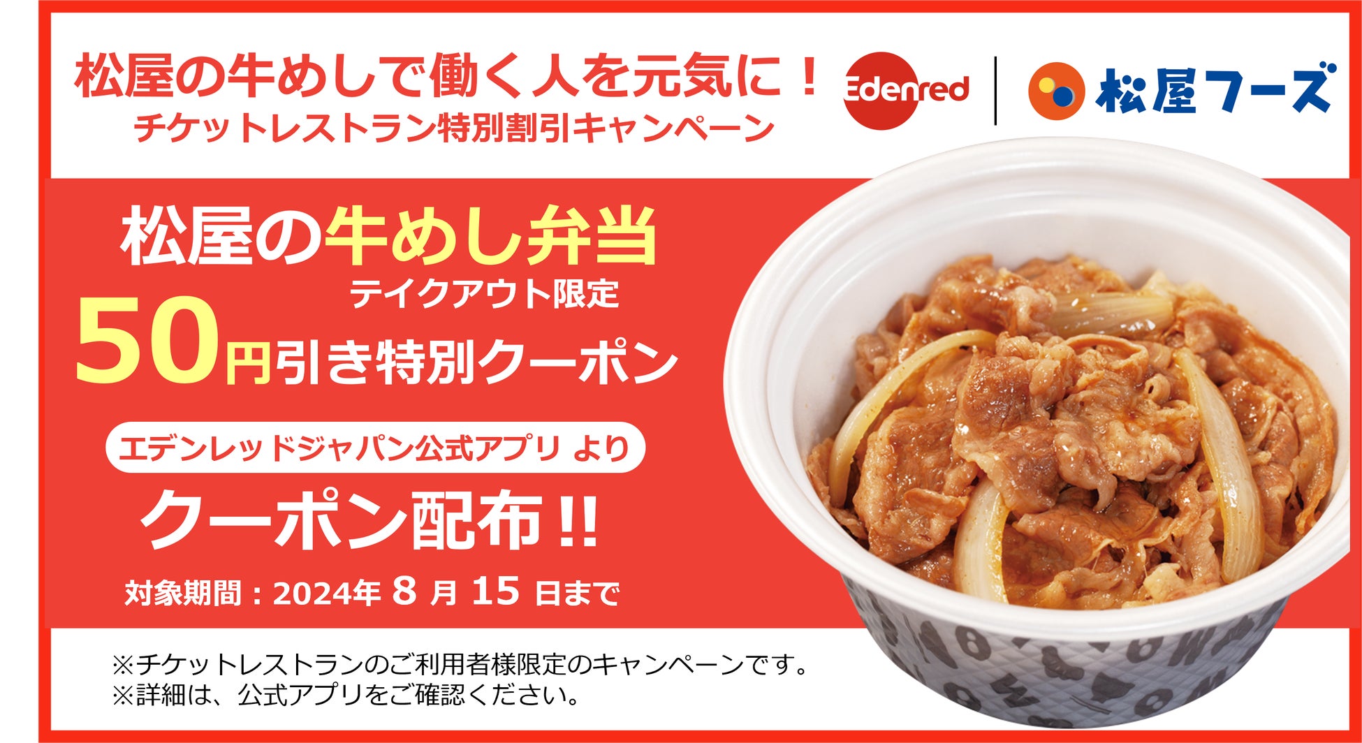昨今から続く物価上昇が家計の大きな負担となっており、ビジネスパーソンのランチ代にも影響を及ぼしていることが当社の調査でも明らかになっています。経済的理由によるランチの欠食頻度が高まっており、週に1日以上ランチを欠食する従業員は4人に1人にのぼっています。さらに今夏は厳しい猛暑の日々が続いており、夏バテ気味で食欲が湧かないという方も多いことでしょう。そこで今回は、松屋様ご協力のもと、エデンレッドジャパンでは初の試みとなる公式アプリでのクーポンキャンペーンを実施することとなりました。人気メニュー「牛めし」が50円引きでお楽しみいただけるお得なクーポンを配布します。ぜひ松屋の「牛めし」で暑い夏を乗り切りましょう。
