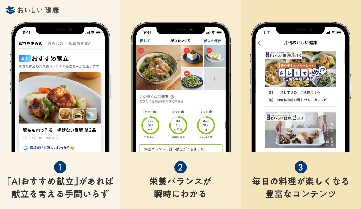 AI による献立・栄養管理支援アプリ『おいしい健康』は、健康な方やダイエット、生活習慣病予備群といった「予防・自己実現のための食事」から、患者や妊婦・高齢者など「医療上の制限がある方の食事」まで、エビデンスに基づく食事管理を、毎日の家庭でおいしく手軽に実践できるよう、サポートいたします。『おいしい健康』では、難しい食事管理をどなたでも簡単に行えるように、一般的なレシピアプリのような使い勝手で実現。個々のユーザーに適した栄養バランスに加え、冷蔵庫の食材や好きな食べもの、料理の腕前や調理時間に合わせた献立を提案する「究極の食のパーソナライズ」を実現し、予防や疾患治療の支援、ひいては「食とデータによる医療費抑制とQOL 向上の両立」という社会課題解決を目指します。