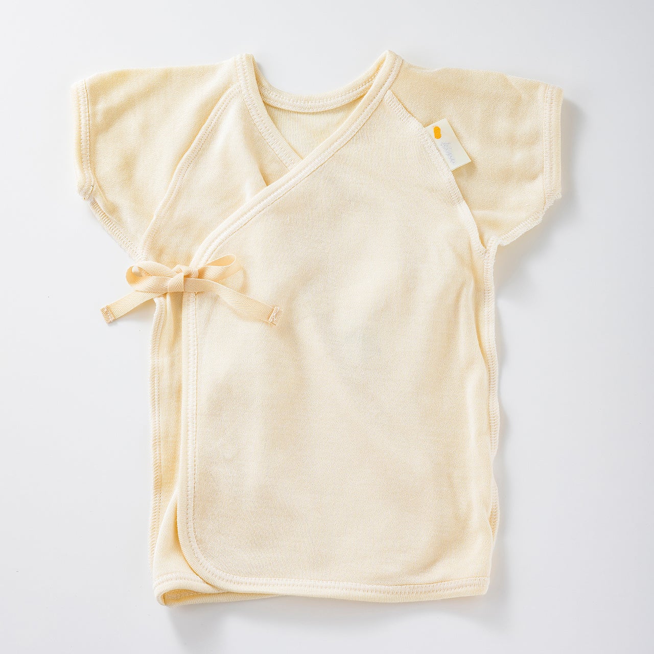 赤ちゃんのお腹から腰あたりまでの丈で作られた肌着です。袖は半袖で前を合わせて紐で結ぶ形となっています。赤ちゃんの素肌に直接触れる短肌着には、汗をかきやすい赤ちゃんの汗取りや体温調節といった役割が求められ、KINUがその効果を発揮します。
