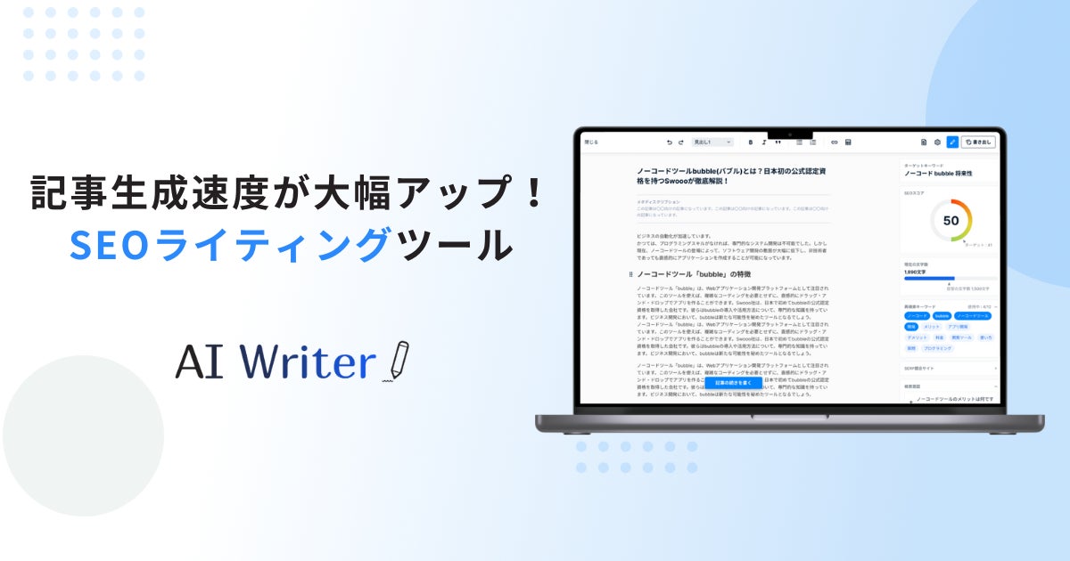 AI Writerは、SEO対策用の記事作成をサポートするAIライティングツールです。記事作成にかかる時間を削減し、ライティングの負担を減らすことで、よりSEOに重要な作業に費やすことができます。