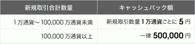 ・新規取引合計数量が5,000万通貨 ⇒ 25,000円キャッシュバック