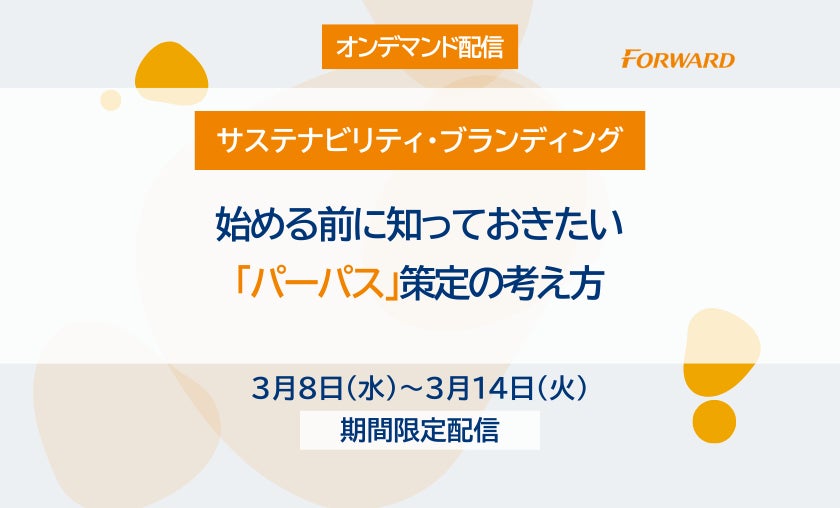 企業のブランド戦略を支援する株式会社フォワード(本社:東京都中央区、代表取締役:伊佐 陽介)は、無料セミナー「始める前に知っておきたい『パーパス』策定の考え方 」のオンデマンド配信を実施致します。2023年3月8日(水)~14日(木)の期間限定配信となっております。