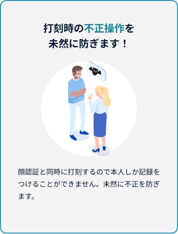 打刻時に顔認証することで、本人以外の不正打刻を防止します。手書きやタイムカード機による打刻とは異なり、社員間で代わりに打刻を押す「友情押し」などの不正を予防することができます。