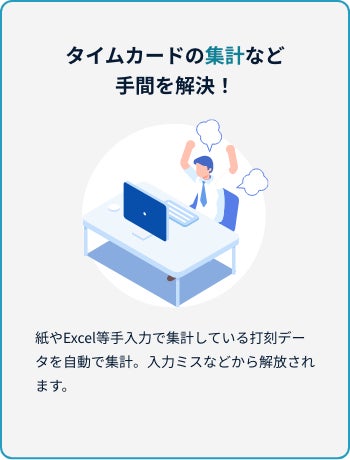 これまでの勤怠システムでは、社員同士での不正打刻の心配がありました。また、手書きやタイムカード機で記録をつけた後、Excelへ入力や集計する手間が発生していました。