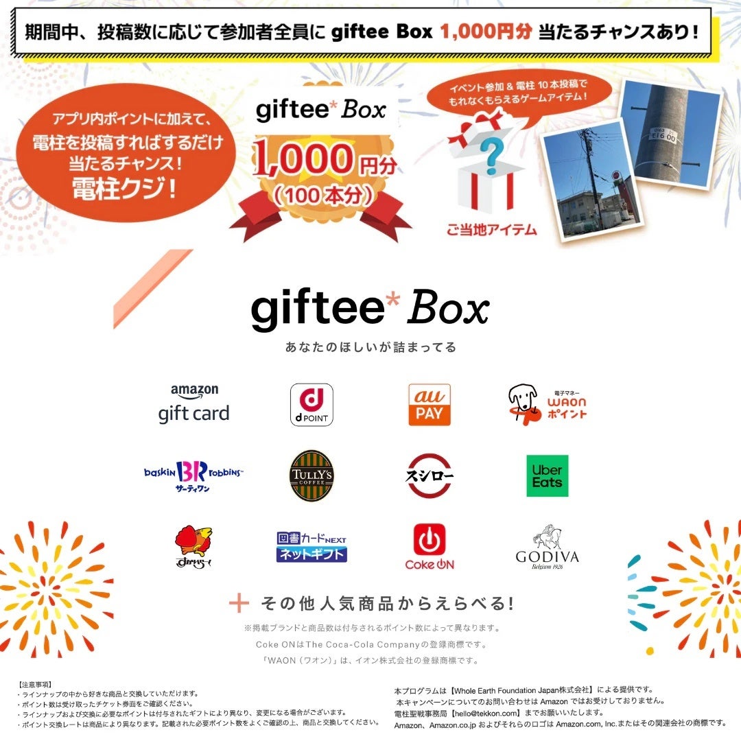 今回のイベントでは、Amazonギフトカードだけでなく、多くの人気商品が選べるgiftee Boxを電柱クジの賞品に採用!!