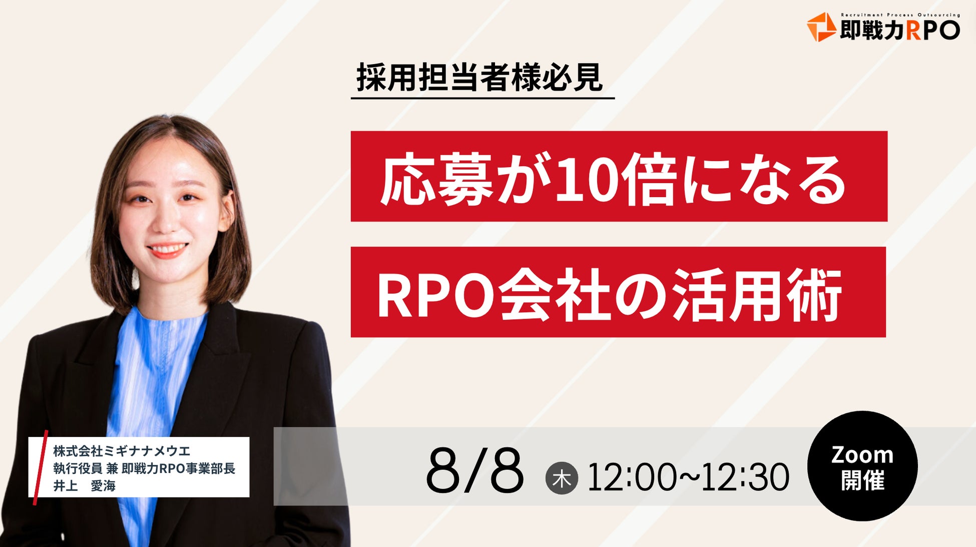 株式会社ミギナナメウエ(本社:東京都渋谷区、代表取締役CEO:古鍜冶 賢)は、2024年8月8日(水)に「採用担当者必見!応募が10倍になる、RPO会社の活用術」のウェビナーを開催します。