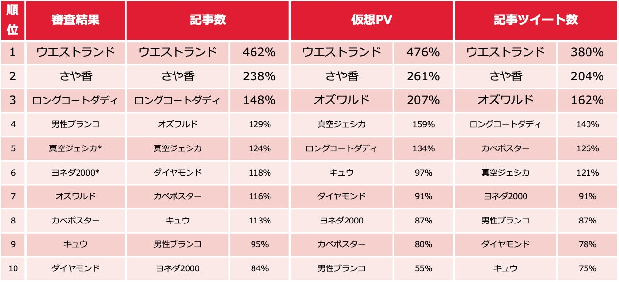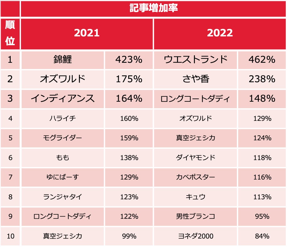 2021年大会後の調査結果では、審査順位が下位のモグライダーやランジャタイが記事などの数値と増加率で中位以上に来ていました。しかし、2022年大会でそうした現象は見られませんでした。