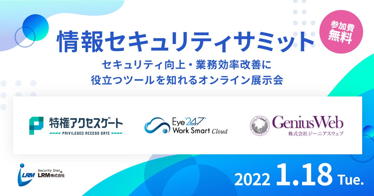 LRM株式会社(以下 LRM、兵庫県神⼾市、代表取締役CEO 幸松哲也)は、改正個人情報保護法の施行が目前に迫る2022年1月18日(火)15時~17時に、個人情報保護・情報セキュリティ向上・業務効率化・DXの推進に役立つツールを各社が紹介したり、個人情報保護に関する講演をおこなったりする無料オンライン展示会「情報セキュリティサミット」を開催いたします。Zoomで気軽にご視聴いただけますので、ぜひご参加ください。
