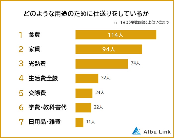 続いて親御さん180人に「どのような用途のために仕送りをしているか」を聞いた結果、1位は「食費(114人)」、2位「家賃(94人)」、3位「光熱費(74人)」となりました。