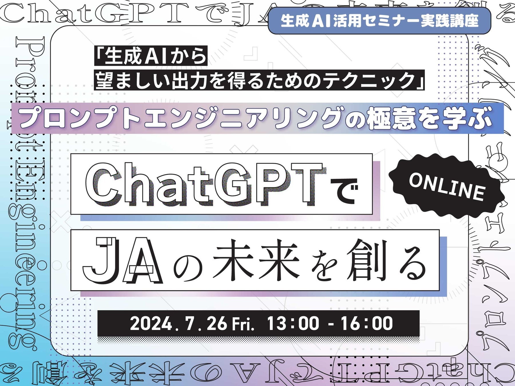 株式会社日本農業新聞(本社:台東区、代表取締役社長:田宮和史郎)は7月26日(金)、「ChatGPTでJAの未来を創る。生成AIから望ましい出力を得るための技術「プロンプトエンジニアリング」の極意を学ぶ!」オンラインセミナーを開催します。