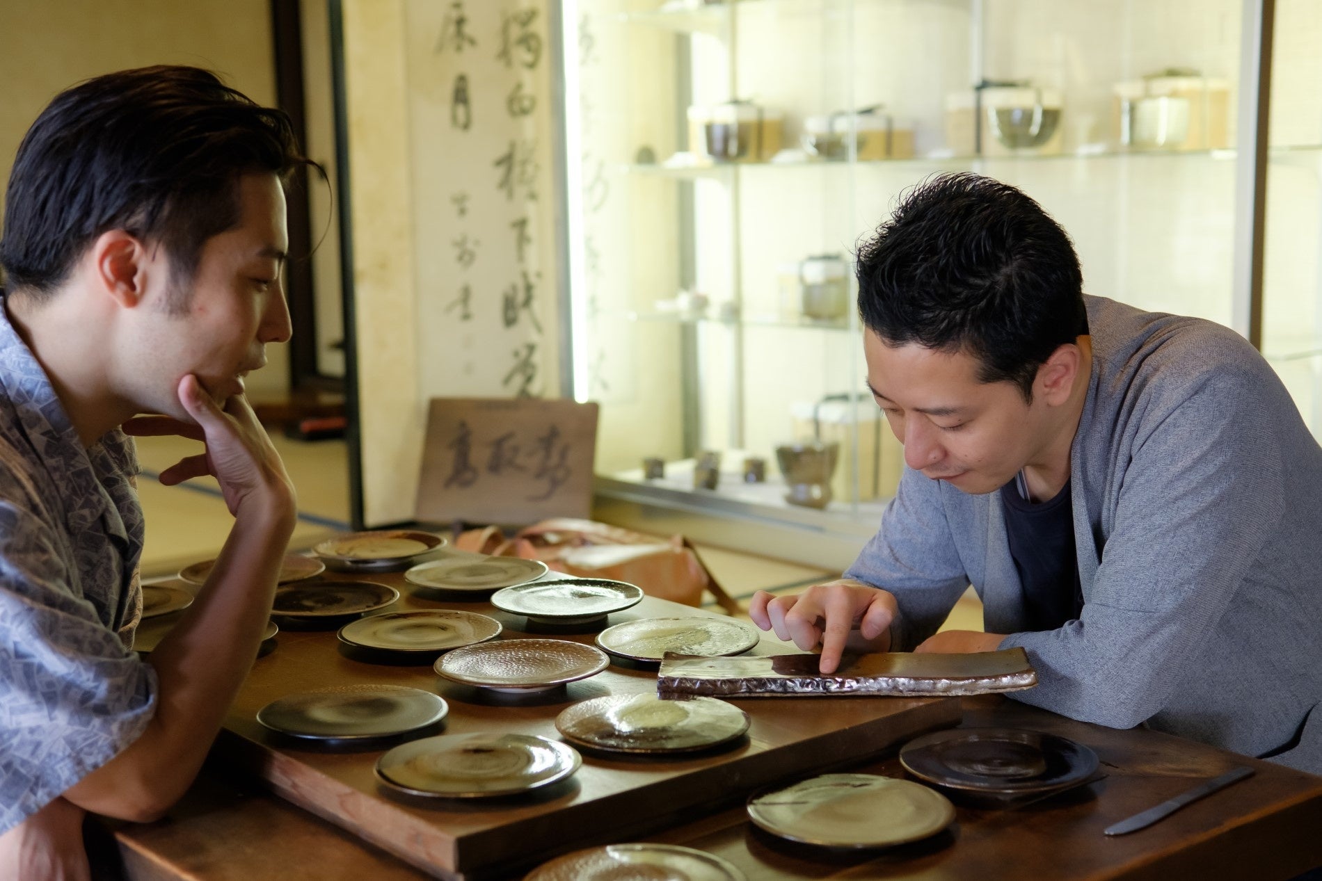 髙取焼宗家を訪ねた料理長・窪津朋生(左)と高取春慶氏(右)