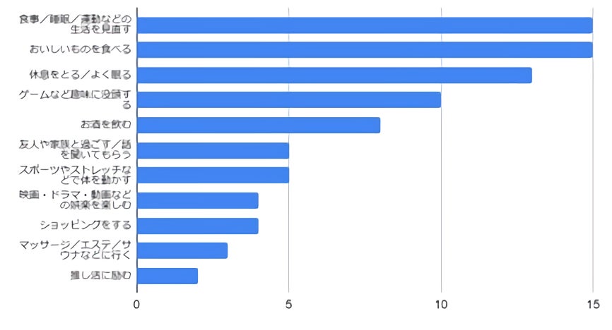 五月病の経験がある人で「気分転換をおこなう」と回答した人は、具体的な対処方法として「おいしいものを食べる」「食事/睡眠/運動などの生活を見直す」と回答しています。