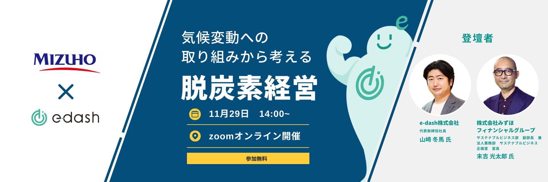 みずほ銀行とe-dash「気候変動への取り組みから考える脱炭素経営」共催セミナー実施e-dash代表取締役社長の山崎が登壇!本日(2022年11月29日)14時〜オンラインで開催