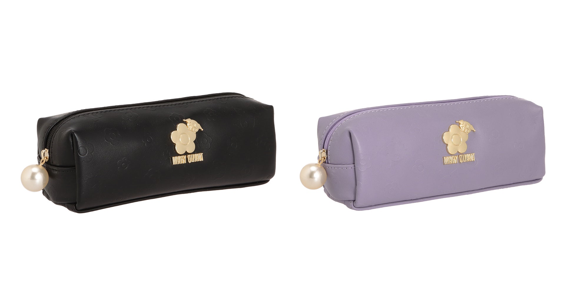 勉強やお仕事中のデスクにもクロミが遊びにきた!ポーチ同様に、コラボ限定ロゴのついたペンケース。コロンとしたスクエア型のフォームとパールの引き手がデザインのポイント。