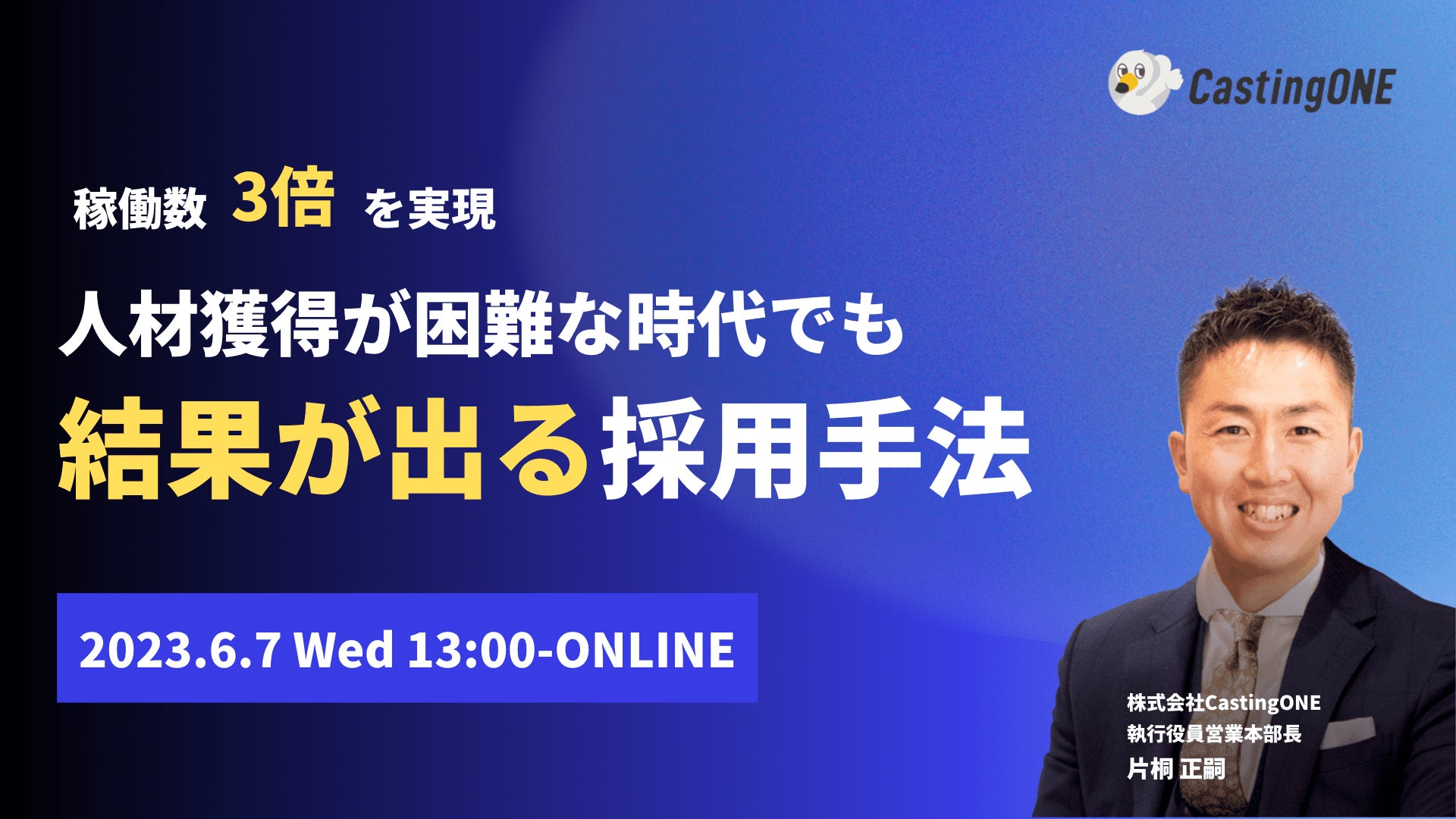 株式会社CastingONE(キャスティングワン、本社:東京都千代田区、代表取締役:野澤 怜司)は、「稼働数が3倍になる採用手法とは」をテーマにしたセミナーを開催いたします。