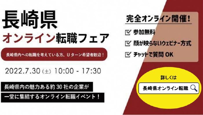 長崎県内の魅力ある企業 約30社が一堂に参加 「令和4年度 第1回 長崎県オンライン転職フェア」開催 【日 時】2022(令和4)年7月30日(土)10時~17時30分