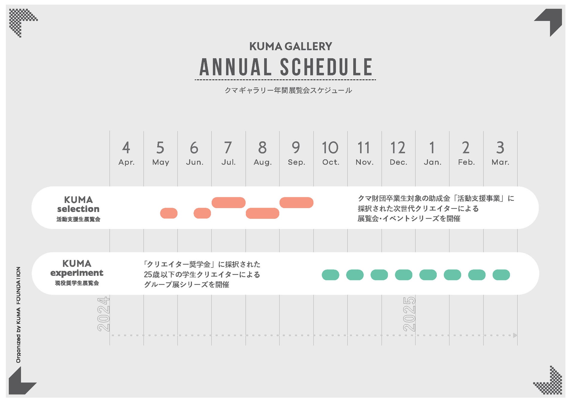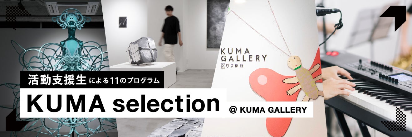 そんな「活動支援事業」の一環として、活動支援生によるシリーズ企画「KUMA selection」を2024年5月から9月にかけて開催します。これまで支援をしてまいりました活動支援生の有志11名にクマ財団ギャラリーを自由に利用する機会を提供し、個展や公演、ライブ、上映会などを各クリエイターが企画して発表します。