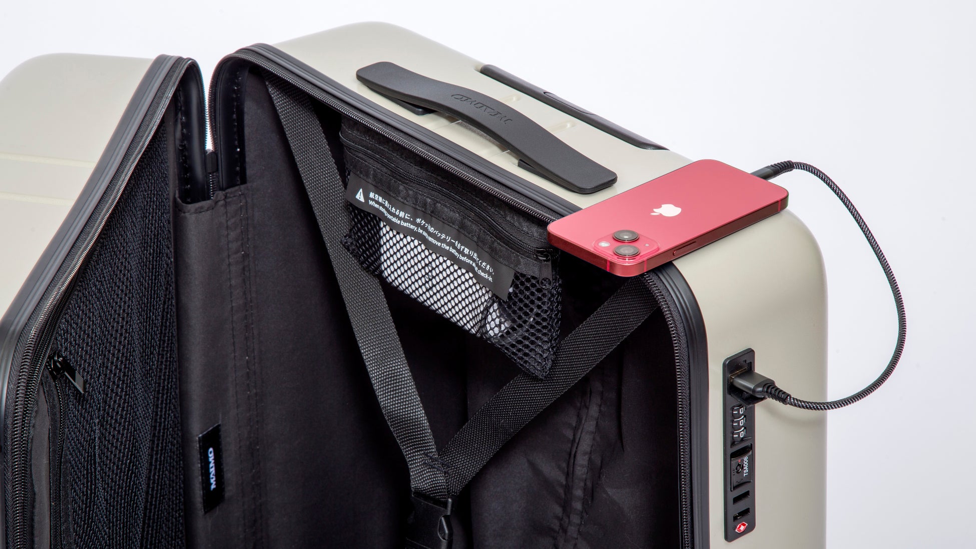ご自身のモバイルバッテリーを収納して、スーツケース側面上部から電源を取ることができます。手持ちカバンにバッテリーを入れる必要がないので、これまでよりも身軽にご旅行いただけます。