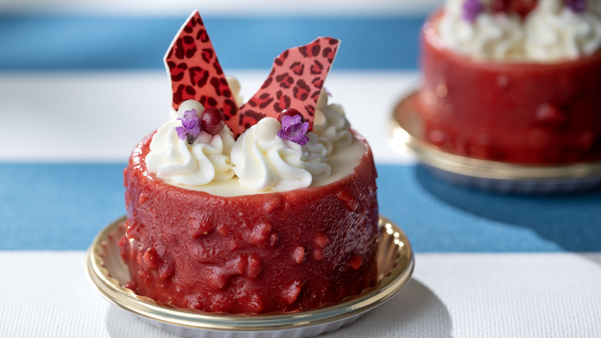 豊かな甘さ、幸せな香りの”はこだて恋いちご”をジュレとクレームにして、爽やかなライム風味のムースで包み込みました。