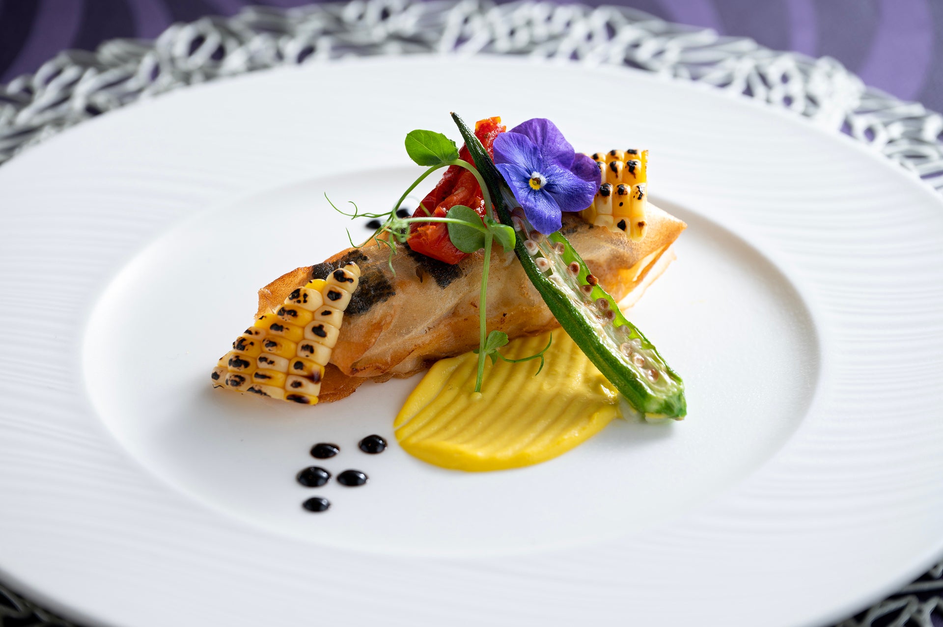 函館産クロソイと夏野菜のパートブリック包み 焼きトウモロコシとピューレ