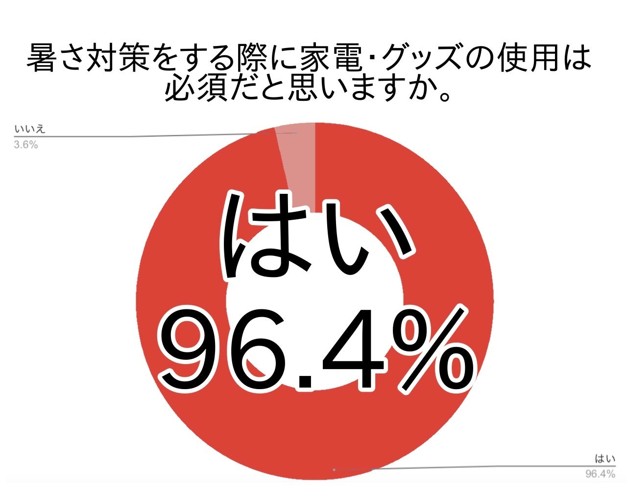 全国の結果では、暑さ対策をする際に家電・グッズの使用が必須だと思うと答えた方は10割弱(96.4%)でした。