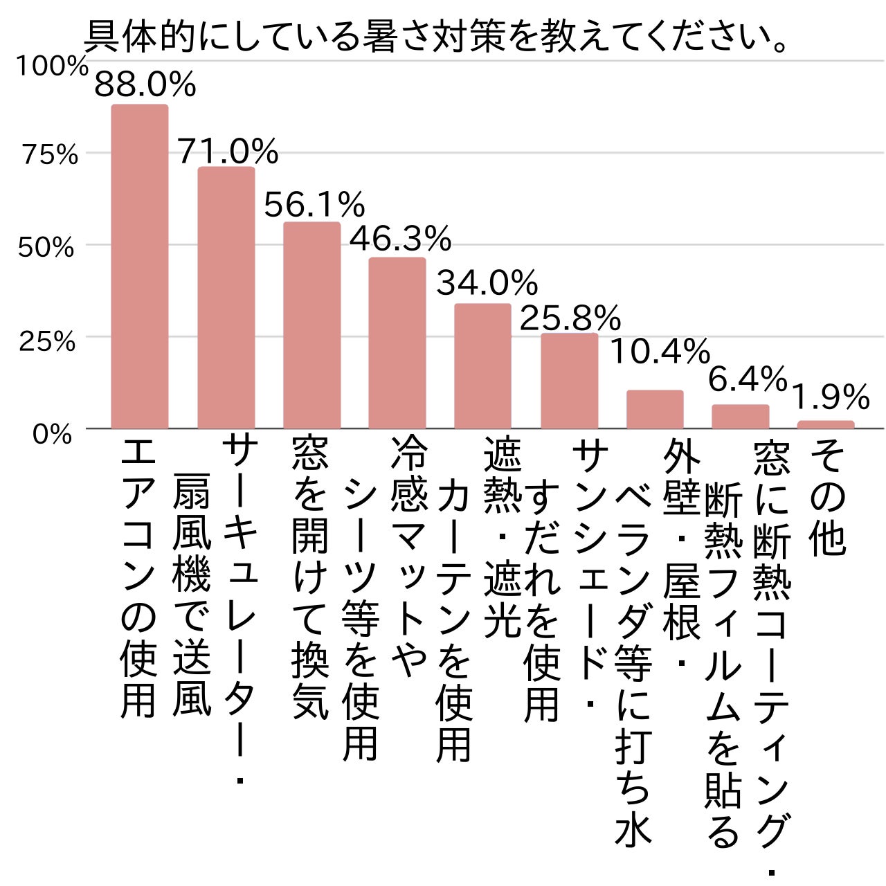 涼しさを感じる対策としては「冷感マットやシーツ等を使用(46.3%)」が多く、他は熱や光を遮ることによって少しでも涼しくするという対策でした。具体的には「遮熱・遮光カーテンを使用(34.0%)」「サンシェード・すだれを使用(25.8%)」「窓に断熱コーティング・断熱フィルムを貼る(6.4%)」等が多く見られました。