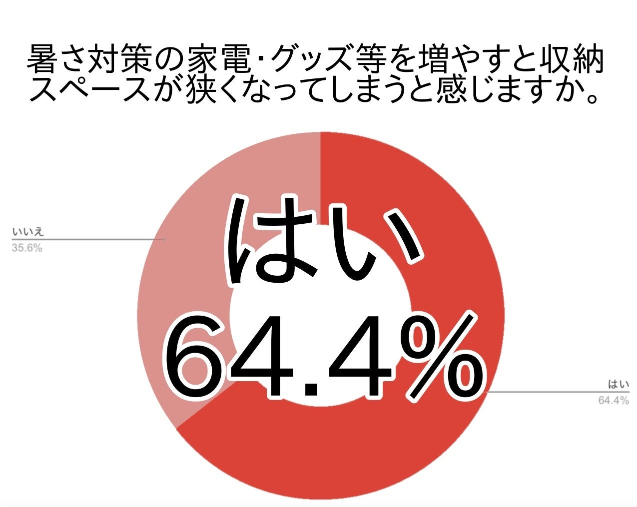 全国のアンケートでは暑さ対策の家電・グッズ等を増やすと収納スペースが狭くなってしまうと感じると答えた方は6割強(64.4%)でした。半数を大きく超える割合で、暑さ対策の家電やグッズによって収納スペースが圧迫されているようです。