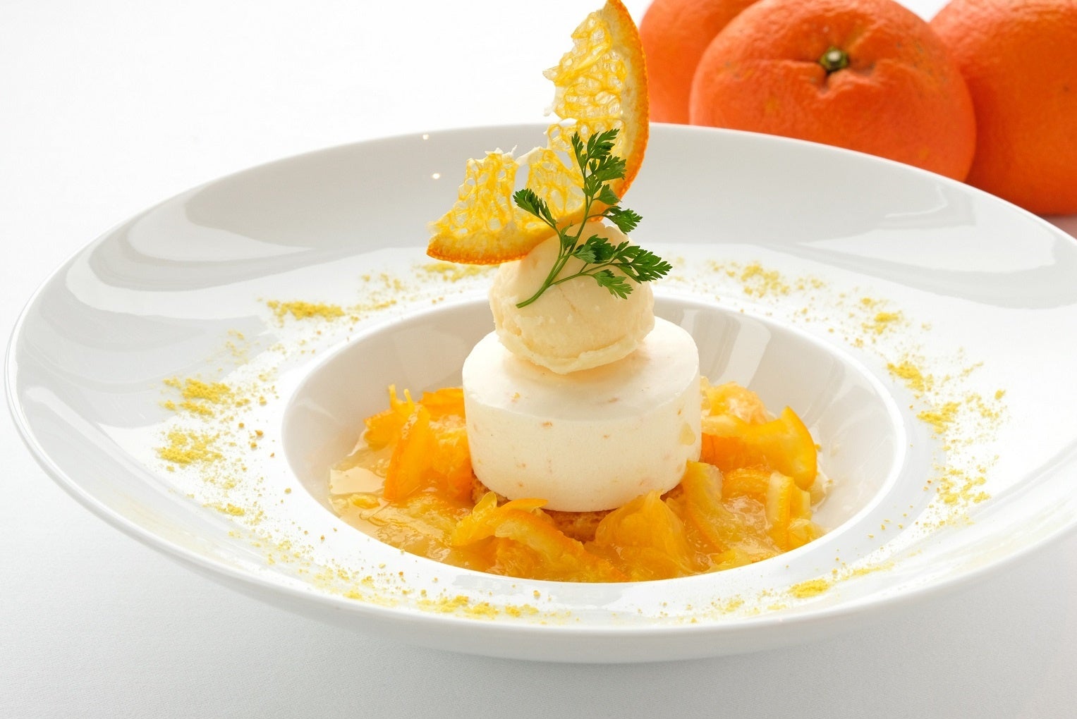 自家製、伊予柑のマーマレードや伊予柑のジュレ、さらにフレッシュの伊予柑の実を真っ白なお皿に敷き詰め、その上にすりおろした伊予柑の皮で風味付けしたムースをのせて、さっぱりとした伊予柑のソルベを重ねました。