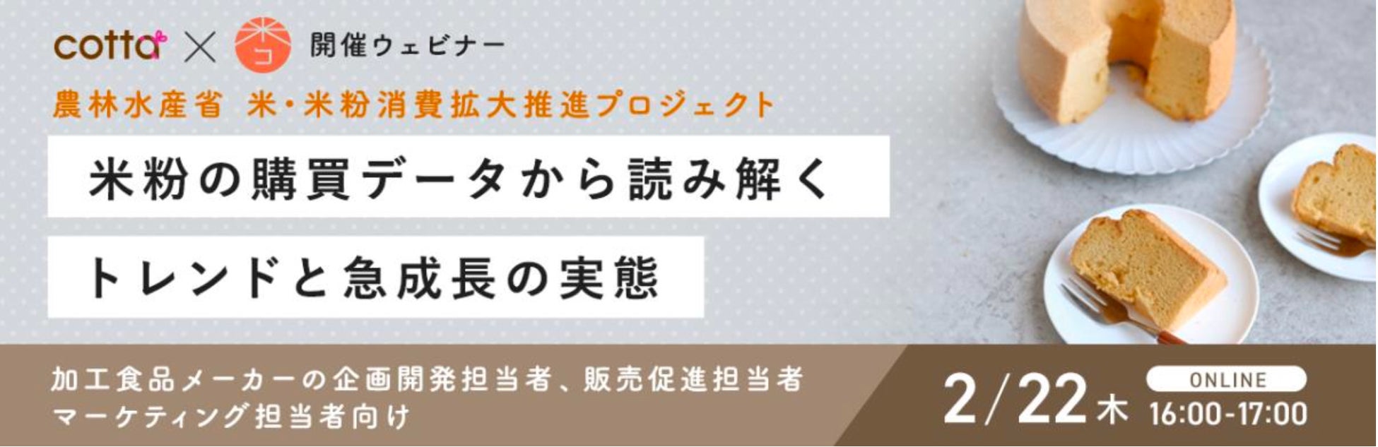 今回のウェビナーでは、そんなトレンドである米粉の実態を、cottaの購買データより徹底解説します。他社との差別化や、新たな市場の開拓に繋げる糸口として、最新トレンドを抑えておきたい方や、商品開発に活かしたい方などに聞いていただきたい内容です。ぜひお気軽にご参加ください。