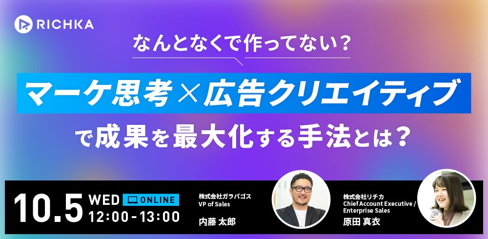 AIを活用したマーケター向けクリエイティブデザイン提供サービス「AIR Design」を展開する株式会社ガラパゴスは、株式会社リチカと共催で、10月5日(水)12時より、無料オンラインセミナー【なんとなくで作ってない?「マーケ思考×広告クリエイティブ」で成果を最大化する手法とは?】を開催します。