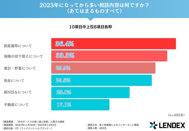 「2023年になってから多い相談内容は何ですか?(あてはまるものすべて)」と質問したところ、『 資産運用について(36.4%)』が最多の回答となりました。