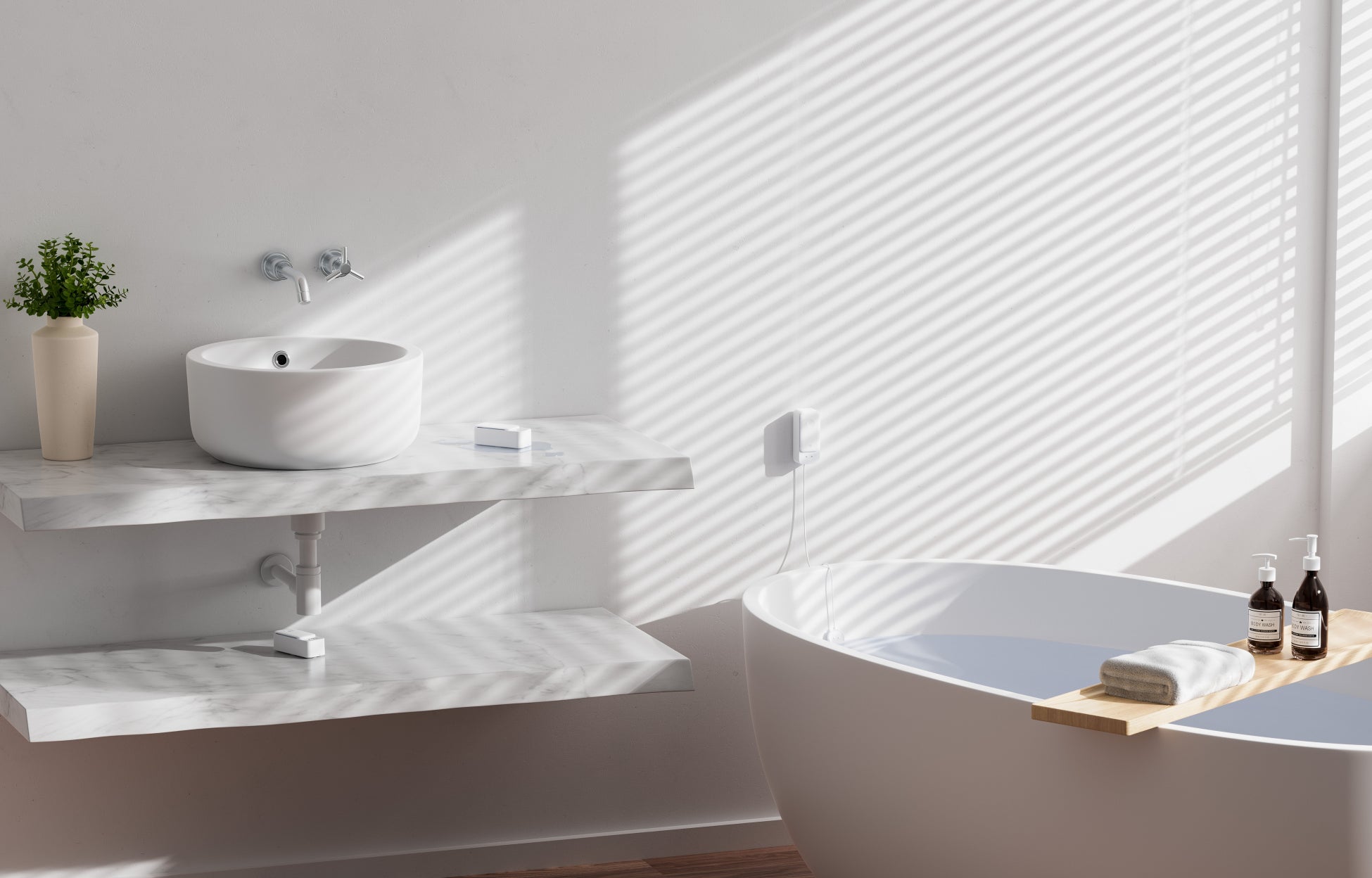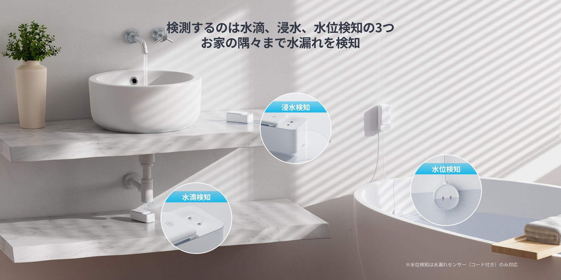 ブランド初となる水漏れセンサーが登場。ハブ製品不要で、外出先にいてもスマホのアプリから、いつでもどこでもリアルタイムで水漏れ状況を把握し、水漏れや浸水による被害を未然に防ぎます。
