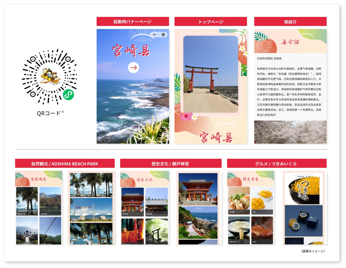 約13億人が日々の生活で利用している中国最大のSNS「WeChat(ウィーチャット)」内に、自然観光(AOSHIMA BEACH PARK・えびの高原・サンメッセ日南など)や歴史文化(鵜戸神宮・宮崎神宮・高千穂夜神楽など)、グルメ(チキン南蛮・釜揚げうどん・つきみいくらなど)のさまざまな情報を、南国宮崎をイメージした明るいデザインとともに、宮崎県の魅力をWeChat(ウィーチャット)ユーザーに対してよりわかりやすく発信いたします。