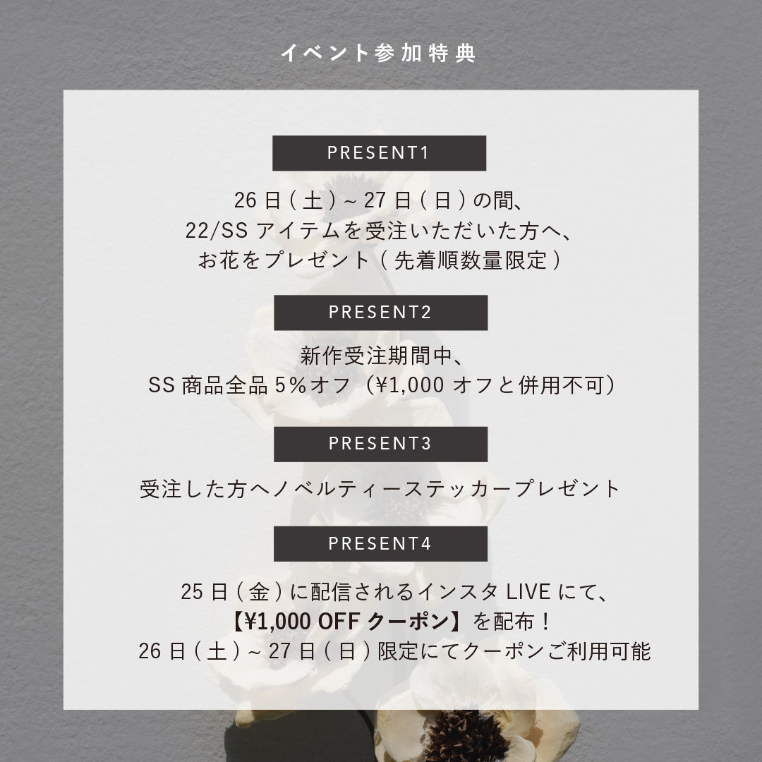 ①2月25日(金) 21:00より配信されるインスタライブにてお知らせの画像を対象期間中店頭にてお見せいただくと、2日間限定でお会計より¥1,000オフ(¥22,000[税込]以上お買い上げの場合のみご使用可能です。)