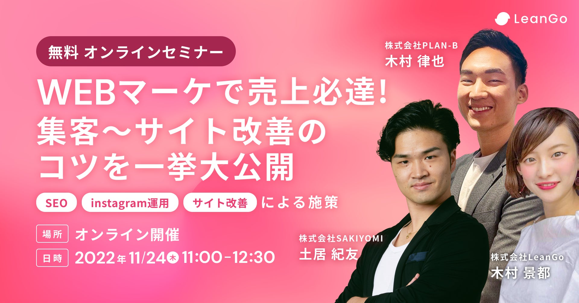【Web担当者必見の無料ウェビナー】Web集客&SNS運用&サイトCVR改善で売上必達のコツを一挙大公開 | LeanGoがPLAN-B、SAKIYOMIと共催