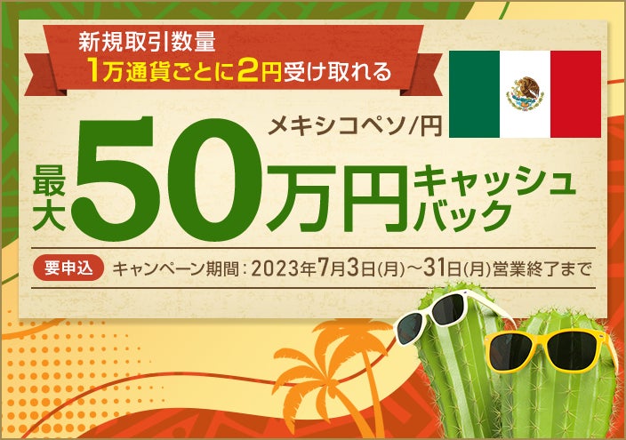 キャンペーンに申し込まれたお客さまに、期間中におけるメキシコペソ/円の新規取引数量に応じて、最大500,000円をキャッシュバックします。