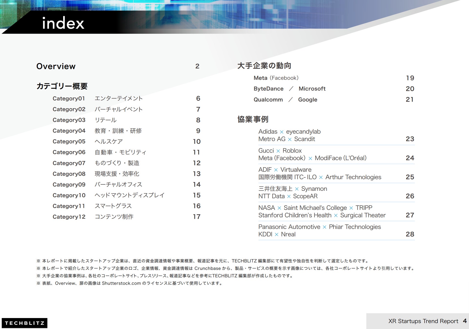 本レポートでは、エンターテイメントからヘルスケアまで生活に身近な場面でのXR、ものづくりからバーチャルオフィスなどのビジネスユース、さらにXRハードウェアとコンテンツ制作ツールについて、カテゴリ別にトレンドと有望なスタートアップをご紹介します。また後半ではMetaをはじめとする大企業の動向や海外スタートアップと大企業との協業事例を掲載しています。
