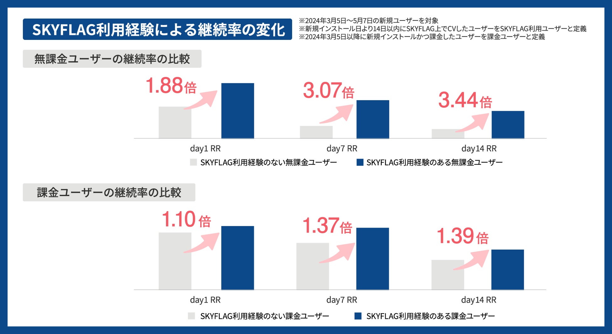 また、『SKYFLAG』を利用したことのあるユーザーと『SKYFLAG』を利用したことのないユーザーを比較した結果、課金ユーザーと無課金ユーザーの両者ともに『SKYFLAG』を利用したことのあるユーザーの方が継続率が高い結果になりました。