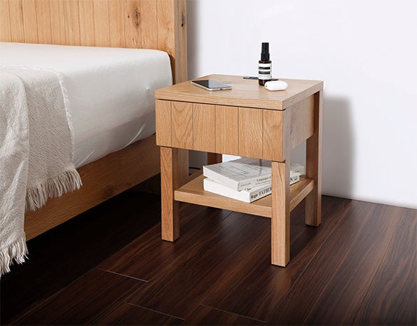 ベッドフレームに合わせたスリットデザインのベッドサイドチェスト。寝室はもちろん、リビングではサイドテーブルとしてもご使用いただけます。
