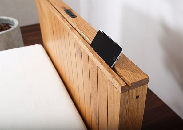 ベッドフレームとサイドパネルの宮部分にはスマホなど立てられるサクリが入っています。ベッドフレームには2口コンセントも付いて機能面も十分です。