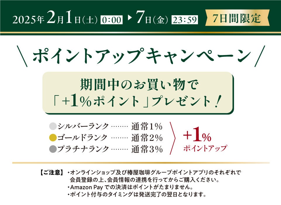 「椿屋珈琲オンラインショップ」にてキャンペーン期間中にお買い物いただくと、「椿屋珈琲グループポイントアプリ」の通常ポイントが1%ポイントアップ!最大4%のポイントを還元いたします。