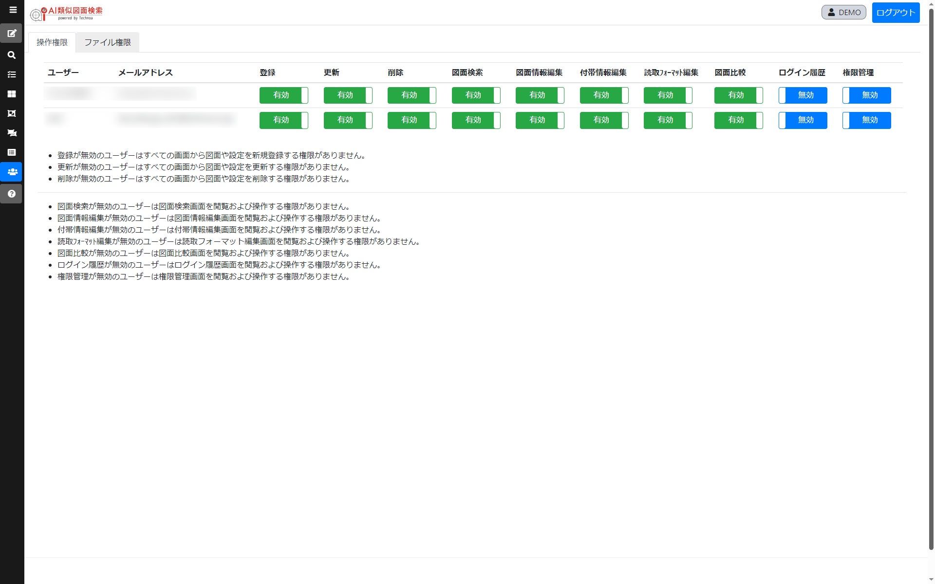 今回のリリースでは、複数名・複数部署での『AI類似図面検索』活用を想定し、担当者別の操作権限を詳細に設定できる管理機能やログイン履歴の確認機能を追加しました。